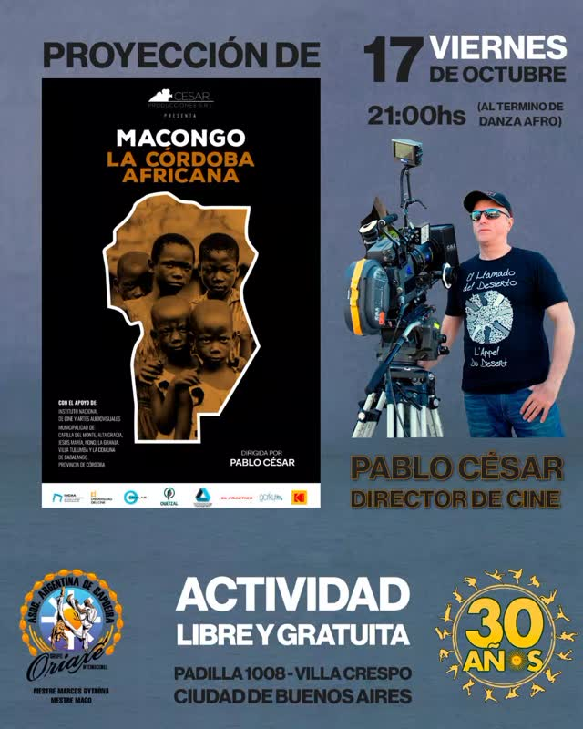 Este viernes 17 de octubre, en la Asociación Argentina de Capoeria, se proyectará el documental argentino Macongo, la Córdoba africana con entrada libre y gratuita y la presencia de su director, Pablo César, para charlar e intercambiar ideas sobre este trabajo con el público.