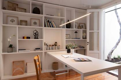 Este espacio de trabajo es estético por la naturaleza de Mariana y la de su emprendimiento, ya que funciona como showroom. La estantería de hierro aprovecha la altura, pintada de blanco se hace liviana y destaca lo expuesto, y su forma de T le pone coto a la mesa y separa del sofá, donde los clientes y proveedores se pueden sentar a conversar.