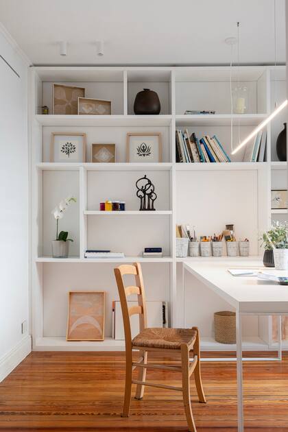 Este lugar corresponde al lugar reformado para la dueña de casa, que es artista. La nueva biblioteca diseñada por las arquitectas Victoria Cornudet y Carolina Cibils, a cargo de la reforma integral, tiene módulos para los materiales que utiliza cotidianamente, además de todo lo que la inspira.