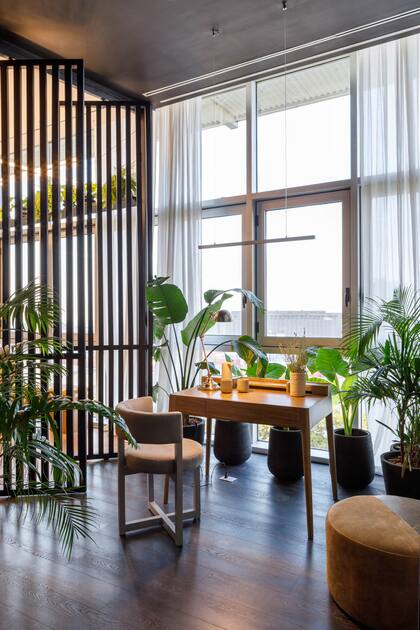 “Como el departamento no tenía balcón, hicimos un jardín interno limitado por tres biombos pivotantes en el lateral”, dicen sobre el espacio bajo estas líneas el arquitecto Martín Drlje Kordich, al frente del estudio M1, y su socia en este proyecto, la arquitecta Sara Plazibat. “Cuando están abiertos, amplían el living y comparten su verde con él; cerrados, crean un ambiente de trabajo reconfortante, con vista y lleno de plantas. Después de todo, la mayoría pasamos el día en la oficina”, sonríen.