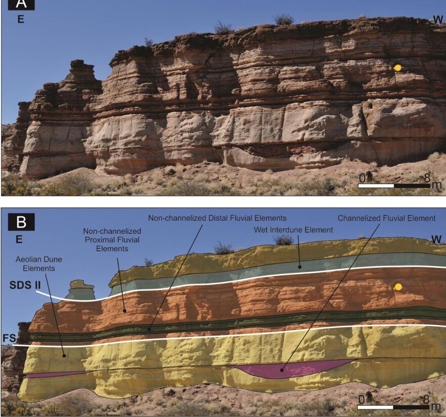 Los expertos en paleontología contaron con el aporte de la geología. Fueron los científicos Gonzalo Veiga, Joaquín Pérez Mayoral, María Lidia Sánchez y Soledad Gualde, quienes permitieron conocer que los 20 metros de depósitos rocosos representan tres etapas que muestran cómo se contraían y expandían los márgenes del viejo desierto Kokorkom como resultado de los cambios climáticos de la época. Las arenas depositadas, endurecidas, compactadas y petrificadas, se conocerían luego como Formación Candeleros.
