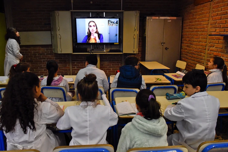Una clase de inglés por teleconferencia en una escuela pública uruguaya