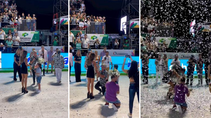 La romántica propuesta ocurrió durante la cuarta noche de los carnavales de Corrientes, provincia de la que ella es oriunda y donde desfiló al frente de la comparsa Ara Berá. Al finalizar la pasada, el histórico productor de Marcelo Tinelli se acercó con su hijo y con un inmenso ramo de flores, tomó el micrófono y se dirigió a Lourdes con el corsódromo Nolo Alías como testigo.