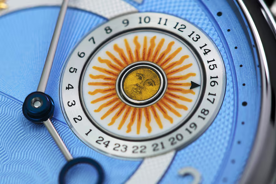 Ese contraste guio el boceto inicial: el cielo arriba, el mar abajo, dos patrones distintos de guilloché (la técnica decorativa que emplea un torno accionado a mano para grabar patrones geométricos precisos y entrelazados sobre el metal), un sol esmaltado en una posición poco habitual y tres estrellas colocadas donde debía estar el número 10. Esa era la verdadera locura, la argentinidad en su máxima expresión. En ese índice no hay un número: hay tres estrellas de oro. Tres.
