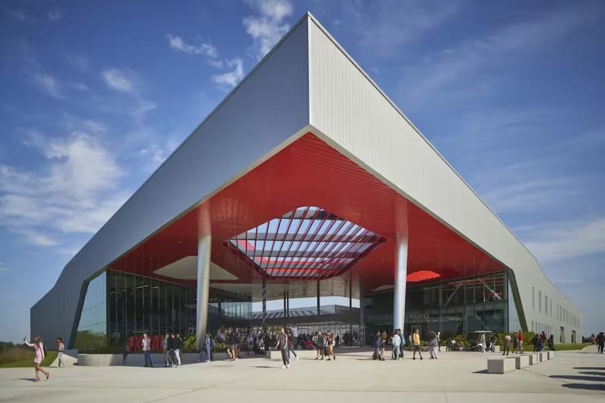 Un edificio trapezoidal gigante con un agujero en el medio se eleva desde las llanuras de un antiguo rancho en las afueras de Tampa, Florida. Revestido de metal brillante, el edificio tiene un brillo futurista y una sensación igualmente futurista en el interior, con laboratorios de ciencia, estudios de robótica y centros de medios de última generación. Entrecierra los ojos, y es la sede adinerada de una startup tecnológica. Pero el edificio es en realidad una escuela secundaria completamente nueva orientada a los trabajos del futuro.