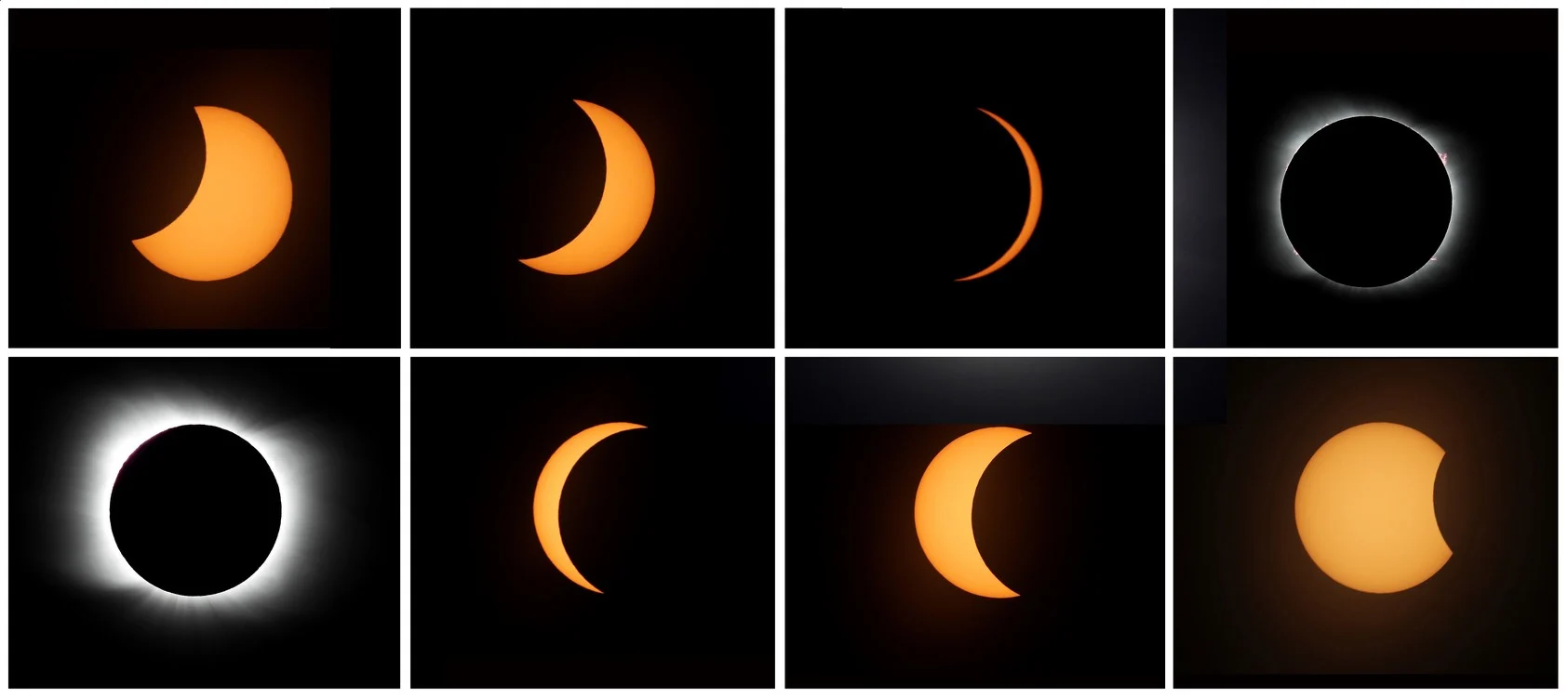 MIRÁ LA GALERÍA DE IMÁGENES. Este combo de fotos muestra la secuencia de un eclipse total de sol visto desde Piedra del Aguila, Argentina, el lunes 14 de diciembre de 2020.