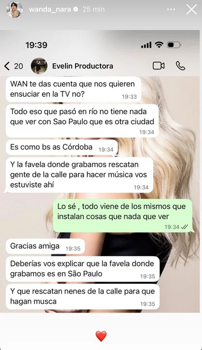 Ante la repercusión del tema, Wanda Nara decidió romper el silencio y publicar una captura de su conversación privada con Evelin, la productora de su videoclip. En la charla, la productora le advierte: “Wan, ¿te das cuenta que nos quieren ensuciar en la TV, no? Todo eso que pasó en Río no tiene nada que ver con São Paulo, que es otra ciudad. Es como Buenos Aires y Córdoba. Y la favela donde grabamos rescata gente de la calle para hacer música”.