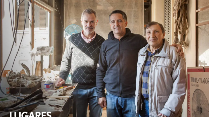 Walter Parra, José Luis Aguilar y Julio Simonini trabajan con los restos fósiles en una sala vidriada del museo.