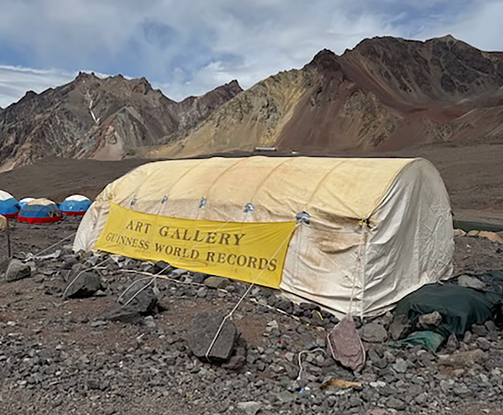 Anoche fue el primer descanso en carpa. No pude dormir muy bien. Los primeros días en la altura me producen apneas de sueño, que me despiertan. Luego se me pasa. Después del desayuno salgo a recorrer el campamento. Estoy intrigado por explorarlo y por encontrar esa carpa autónoma, que ya sé que existe y que quiero conocer. Me dijeron que está más arriba. Empiezo a caminar despacio. Calibro el ritmo de los pasos para que no me agite. Después de un rato de ascenso, la encuentro: el Nautilus. Es un semicilindro blanco, con un cartel en el frente que dice “Art Gallery”. Al frente, hay una plazoleta con palmeras plásticas y césped sintético. Sobre el lado Este otro cartel, más grande, dice “Art Gallery Guinness World Record”. Un mástil señala muchos destinos y sus distancias hacia allí, como Dubái, Tokio, París, Moscú. Golpeo las manos. Permiso… Adelante, Adelante. Miguel Goura se incorpora de una hamaca paraguaya en la que estaba acostado. Le doy la mano. Me presento. Viste un gorro de lana, campera de plumas, pantalón multicolor y está descalzo. Le pregunto si me permite hacerle una entrevista a la tarde. Sí, sí, dale, así se la muestro a mi mamá.