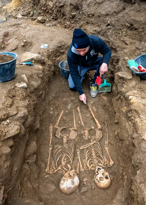 Los investigadores también hallaron alrededor de 50 esqueletos humanos. Las primeras observaciones realizadas por antropólogos indican que la mayoría pertenecen a hombres de entre 20 y 40 años de edad, con una constitución física robusta. En algunos casos se detectó un clavo colocado a la altura del pecho, una práctica ritual documentada en la antigüedad y vinculada a creencias destinadas a alejar el mal en el más allá.