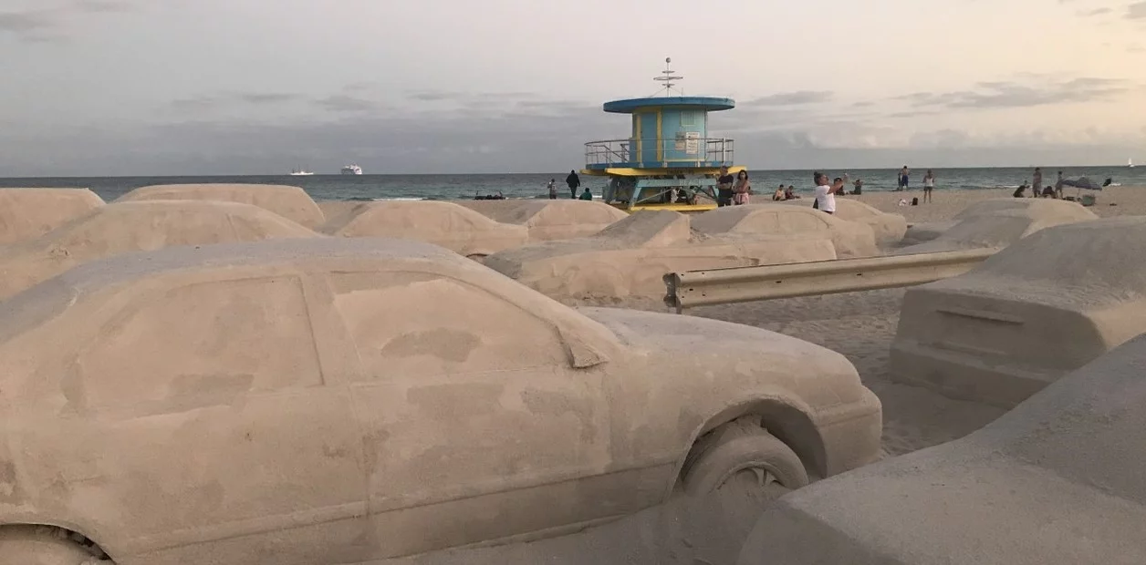 Los autos de molde y tamaño real fueron ensamblados por unidad en un taller de Homestead, en el sur, y acabados sobre la playa. Erlich y la curadora cuentan que debieron cumplir con parámetros estrictos de sostenibilidad. Tanto ellos como las autoridades (Brandi Reddick, responsable de Cultura de la comuna de Miami Beach, asegura que no se han empleado carrocerías verdaderas ni neumáticos ni tóxicos para adherir la arena). Pero la composición de los autos no ha sido aclarada. «Lo siento, no vamos a contar los trucos del mago… -se disculpa Caminos-. No son 100% de arena, tienen un interior sustentable porque al trabajar por comisión de la ciudad, estamos obligados a parámetros férreos. Han sido hechos para durar unos 15 días».