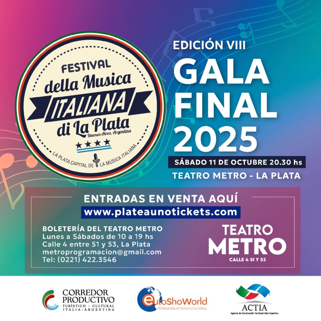 Cabe recordar que La Plata fue declarada, por ley, Capital de la Música Italiana y Capital del Emigrante Italiano. Las entradas para el evento final pueden adquirirse en www.plateaunotickets.com, a través del 01163802002 o en la boletería del Teatro Metro de lunes a sábados de 10:00 a 19:00.