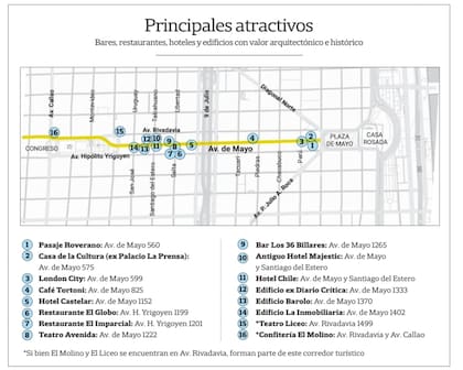 Si hay algo que define a la Avenida de Mayo es haber sido testigo privilegiado de la vida social de los últimos 130 años de la ciudad de Buenos Aires. Las fachadas de estilo art nouveau, neoclásico y ecléctico que bordean las diez cuadras que separan a la Plaza de Mayo de la del Congreso han visto de todo. Vieron a la infanta Isabel de Borbón celebrar el centenario de la Argentina y a Carlos Gardel entrar al hoy desaparecido café París para cantar junto a su par uruguayo José Razzano; en tiempos de la guerra civil española fueron testigos de las rencillas entre republicanos y falangistas: los primeros se reunían en el bar La Toja, en la esquina de Av. De Mayo y Salta; los segundos enfrente, en el Español.