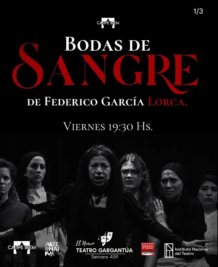 En primer lugar, forma parte del elenco de Bodas de sangre, una versión del clásico de Federico García Lorca, que se está poniendo en escena los viernes de este mes de noviembre en el Teatro Gargantúa, a las19.30. Con quince actores en escena y la dirección de Max Ochoa, la obra es una propuesta de la Compañía Carpediem. Gargantúa está ubicado en Serrano 459, Villa Crespo.