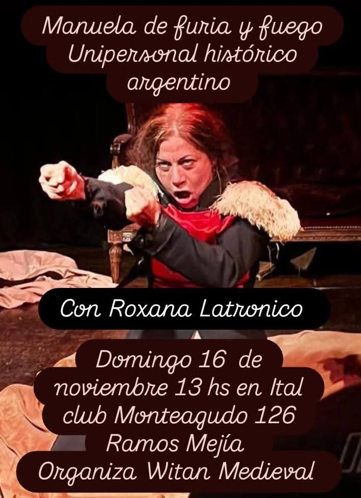 Finalmente, el lunes 15 de diciembre, Roxana Latrónico presentará Manuela de furia y fuego en la Unidad Penitenciaria de Florencio Varela, en la última función del año.