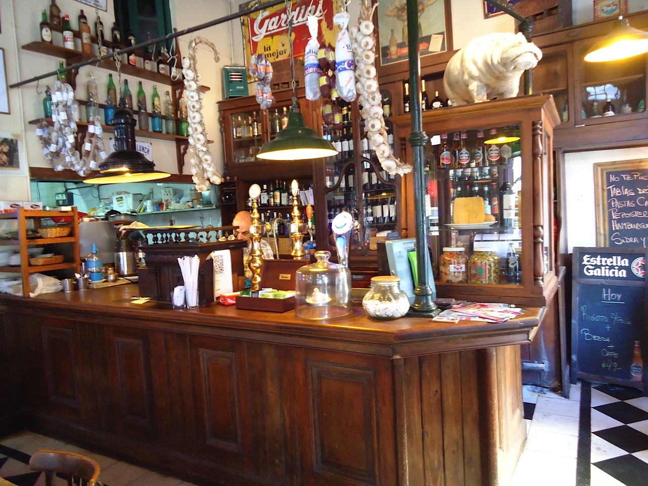AS El público a la mañana es la gente del Barrio, gente que se conoce, que desayuna, que lee el diario, que intercambia opiniones, de mesa en mesa, que habla de fútbol, de política, de todo un poco… se enojan, se pelean, ya son amigos… son los clientes de todos los días, a los que no les tenés que preguntar que toman, si les preguntás se enojan, porque ya sabés quién es el que toma café, el té, ¾ de taza, medialunas calientes o no… ese es el público de siempre, el parroquiano. Al mediodía es un poco cambiante …gente de trabajo y demás… a la noche, es otro bar, ya ahí está la gente que viene siempre pero hay mucha gente que no sabés quienes son; se mezclan turistas con vecinos, con gente de paso y que, para mí, vienen por la historia y seguramente por el menú también. Nosotros tratamos de que la comida sea lo más casera posible, en invierno. ahora, ya empezamos a hacer todos los días guiso de lentejas, mondongo, tenés también medallón de lomo, milanesa, suprema, tenés toda una versión Hipopótamo que es muy grande y las pastas caseras, los ravioles de pavita, rúcula y nuez que ya son un clásico nuestro, también de verdura, ricota…. y demás Y también está orientado a todas las edades, porque es un lugar con “onda”, es piola, no es un lugar súper pituco ni tampoco es una fonda y ese es el típico bodegón.